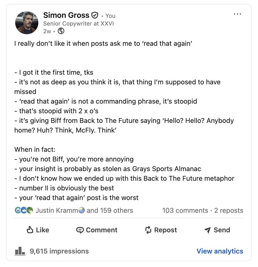 The brand work is safer, so I’ve included some of my LinkedIn content to help you see my range. Starting with some slightly passive aggressive postcards designed to help people have those difficult conversations with coworkers.